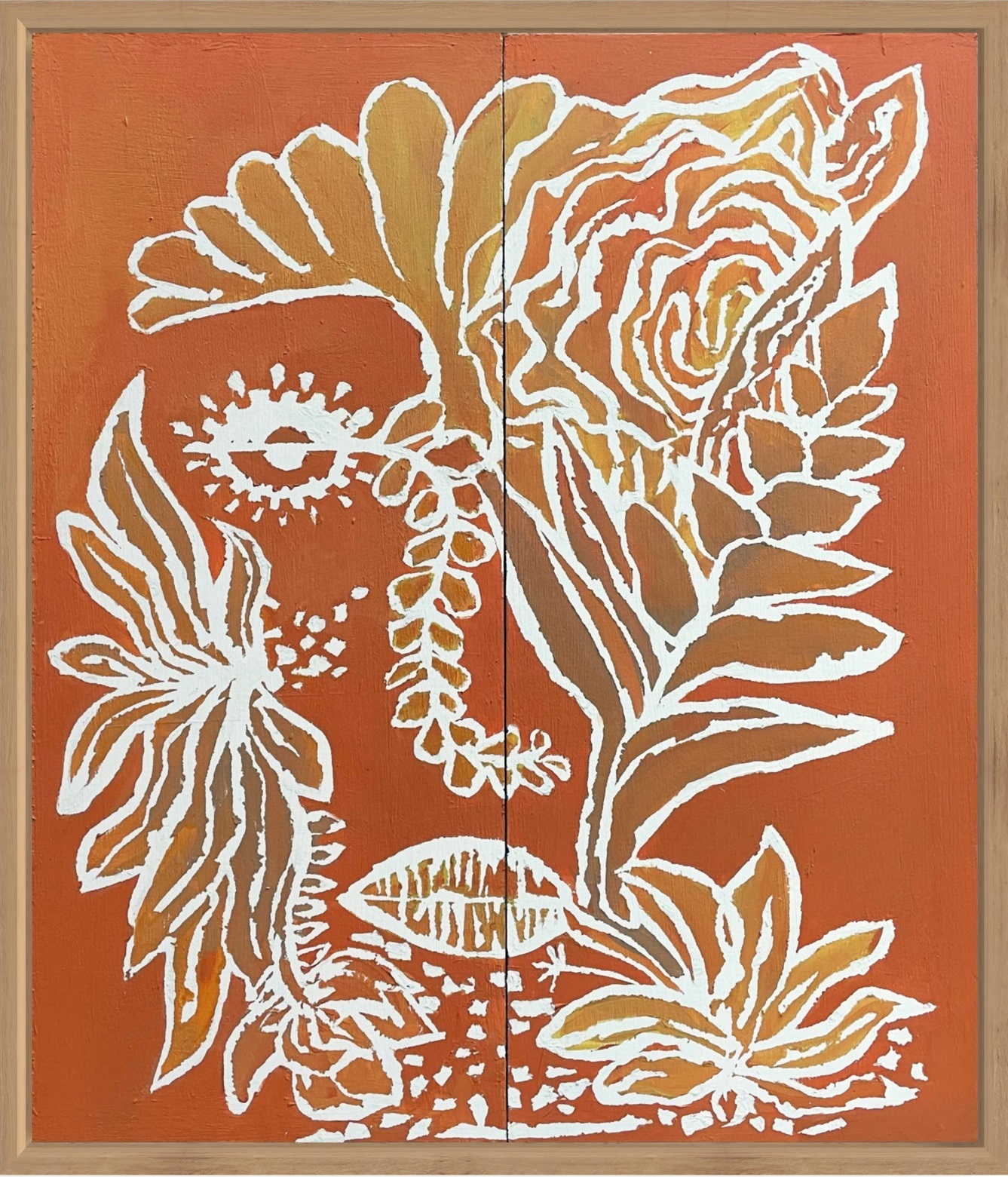 La composition équilibrée de ses oeuvres se caractérise par des lignes naïves et un jeu de contraste coloré, entre positif et négatif. Sa palette, composée essentiellement de teintes et pigments naturels, renforce l’aspect brut de ses aplats de couleurs. C’est dans cet ensemble harmonieux et onirique que s’entremêlent allègrement les éléments vivants des cultures ancestrales et contemporaines qu’elle côtoie.