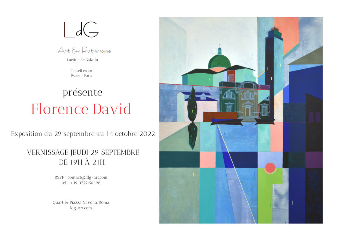 Pour la première fois, Florence David va dévoiler sa facette d’artiste avec un riche corpus d’œuvres mêlant bas-reliefs en bois découpé et peintures à l’huile sur papier et toile. Grâce à sa connaissance pointue de l’histoire de l’art et de l’architecture italienne, elle nous fera rêver à de nouveaux mondes en associant ses propres formes à des couleurs pures, se rapprochant ainsi de la peinture métaphysique italienne des années 1910-1920 en cherchant à représenter par une précision dans la définition des formes et des structures chromatiques ce qui au-delà de l’apparence physique de la réalité. Sa première exposition personnelle et italienne chez LdG Art & Patrimoine sera un voyage architectural artistique.