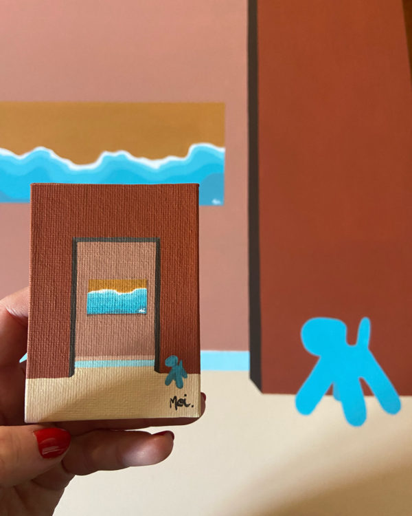 Dans ses décors modernistes, Sara Bagot se change en Moi. ! Comme teinté d’un coquin second degré, le travail de cette artiste qui – entre innocente expression de sa pâte et subtile auto-promotion – joue de cette signature pour titiller la figure de l’artiste. Une légèreté que l’on retrouve dans sa peinture avec un clin d’œil aux maîtres du design, par la présence discrète de pièces iconiques posées dans ses compositions d’architecture pure. Tandis qu’à la rigueur des compositions, contraste la douceur de sa palette, douce et chaleureuse, du terra cotta au bleu pastel.