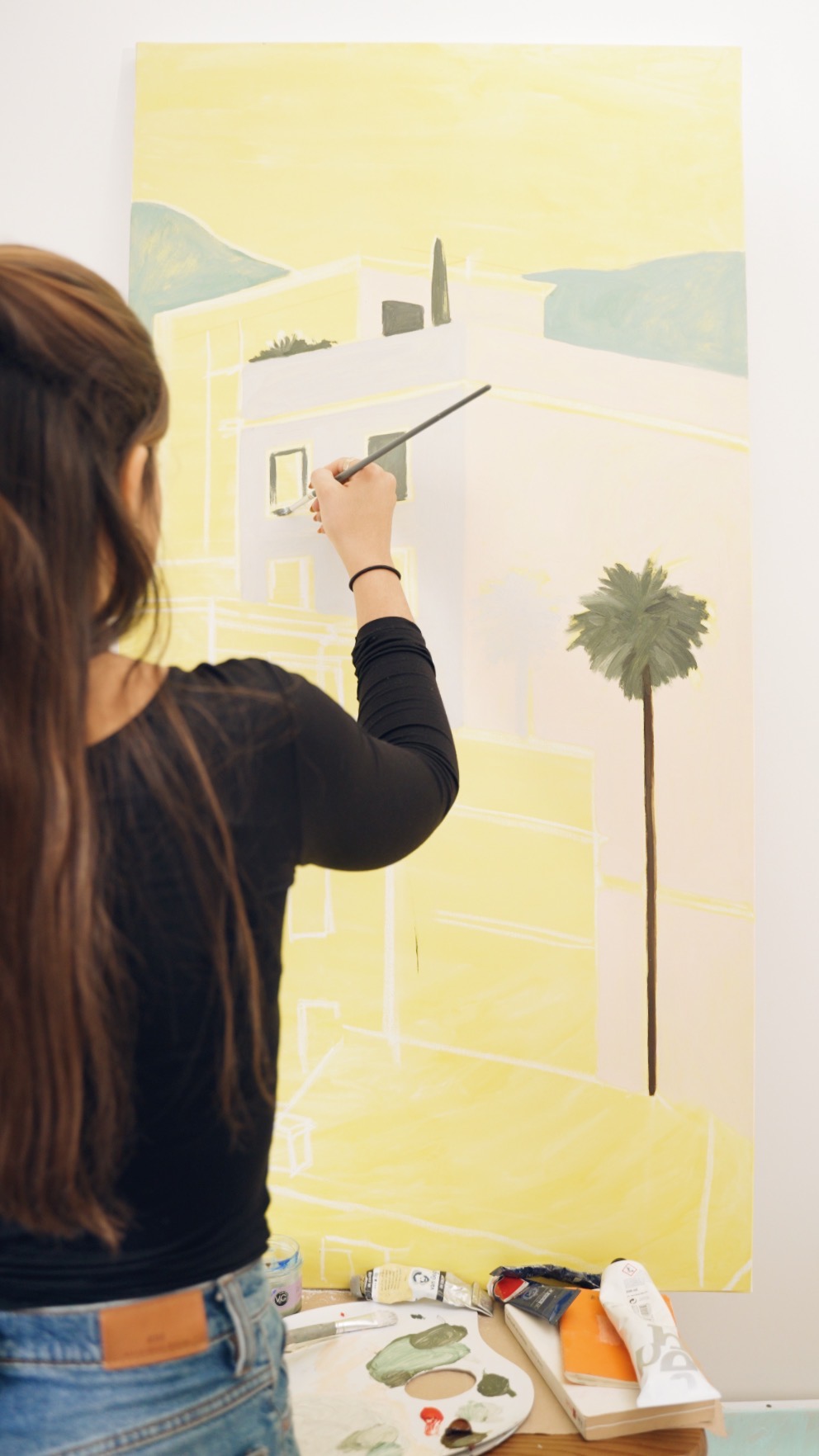 Un morbido universo di toni pastello, un’ode al paesaggio mediterraneo e all’architettura del sud. Attraverso un disegno delicato arricchito da una pittura a olio strutturata, Loubna cerca di catturare quella speciale luce italiana. Presenterà a Roma una collezione di opere esclusive nella sua mostra personale “Da dove sgorga l’oro” dal 13 al 28 aprile.