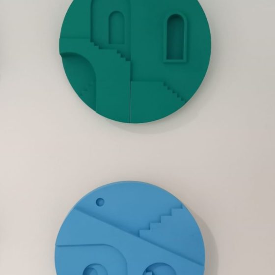 Bas-reliefs en bois et carton découpés au laser et peints. Diamètre 17 cm.
