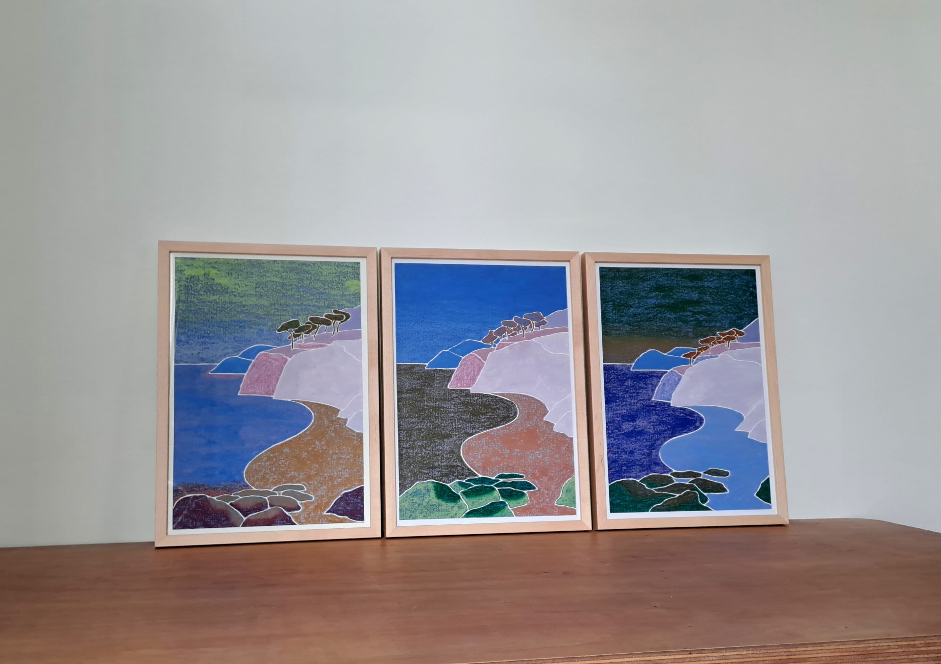 U n e j o u r n é e d a n s l e t e m p s 2 0 2 5 T r i p t y q u e P e i n t u r e à l ’ h u i l e s u r p a p i e r 4 2 x 2 9 , 7 c m l e c a d r e