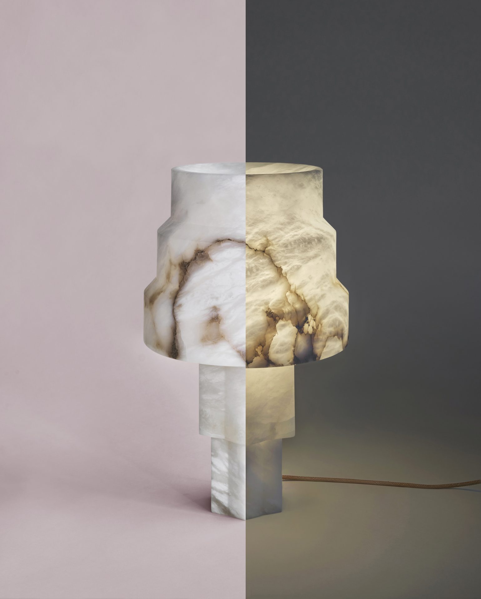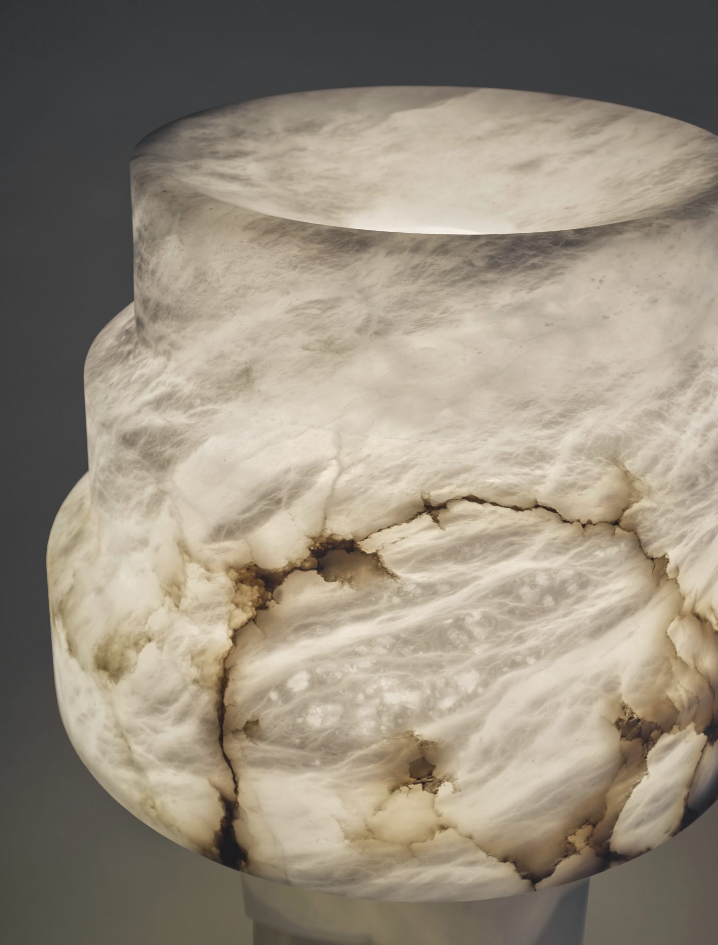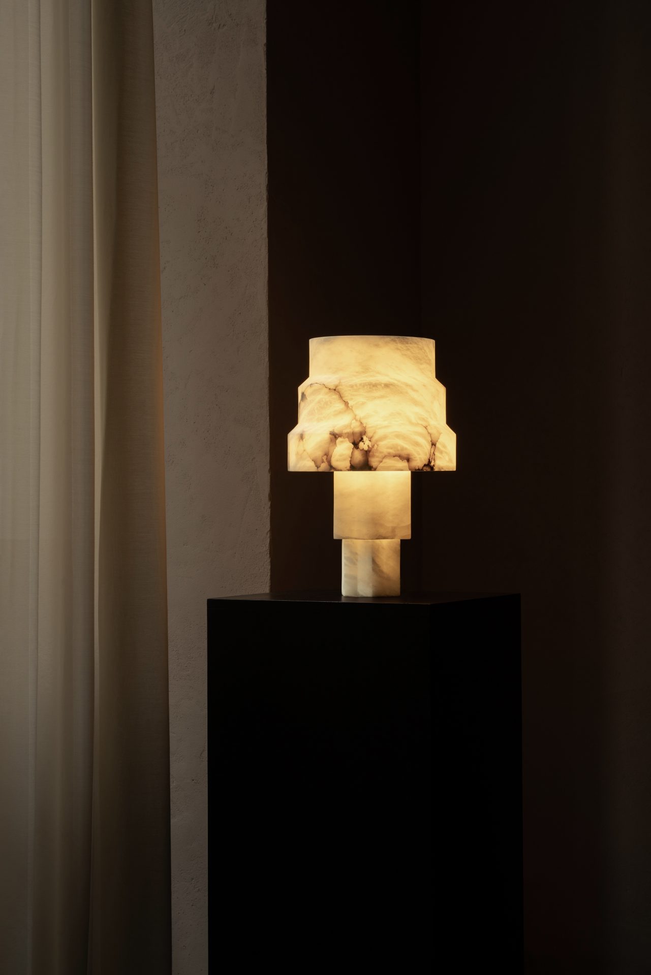 Dans un vocabulaire toujours très géométrique, cette famille de lampes révèle la matière translucide et organique de l’albâtre.