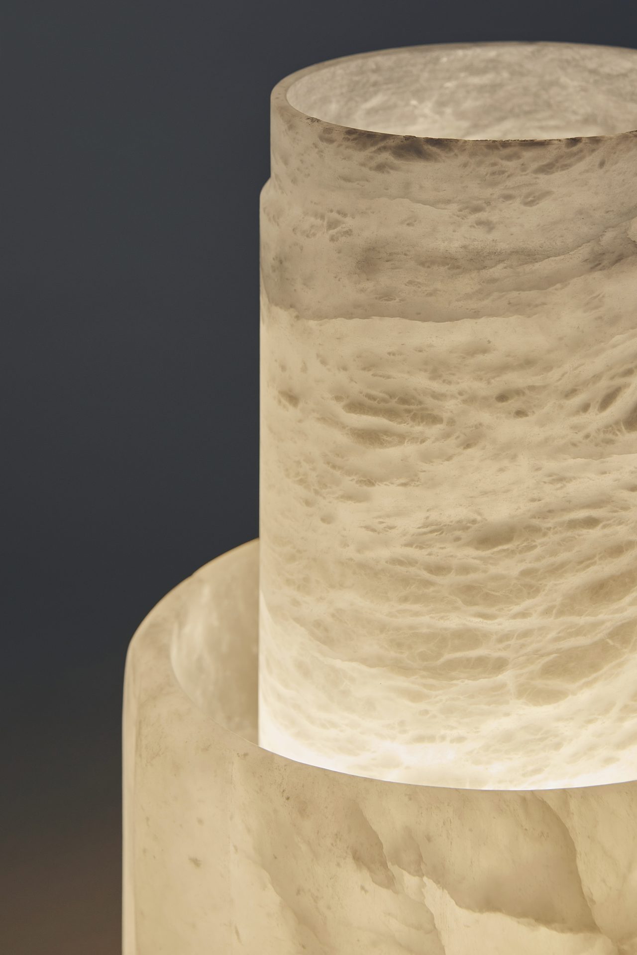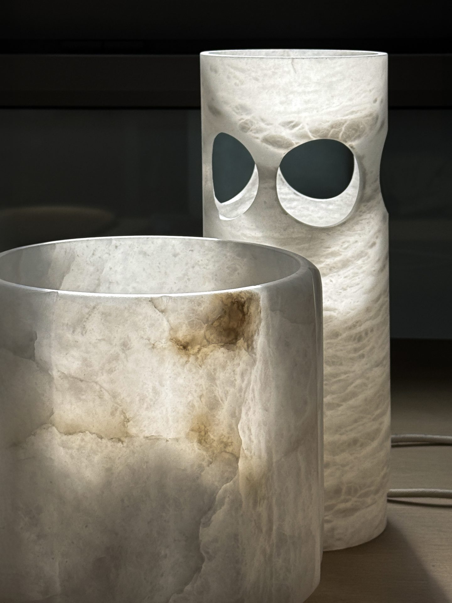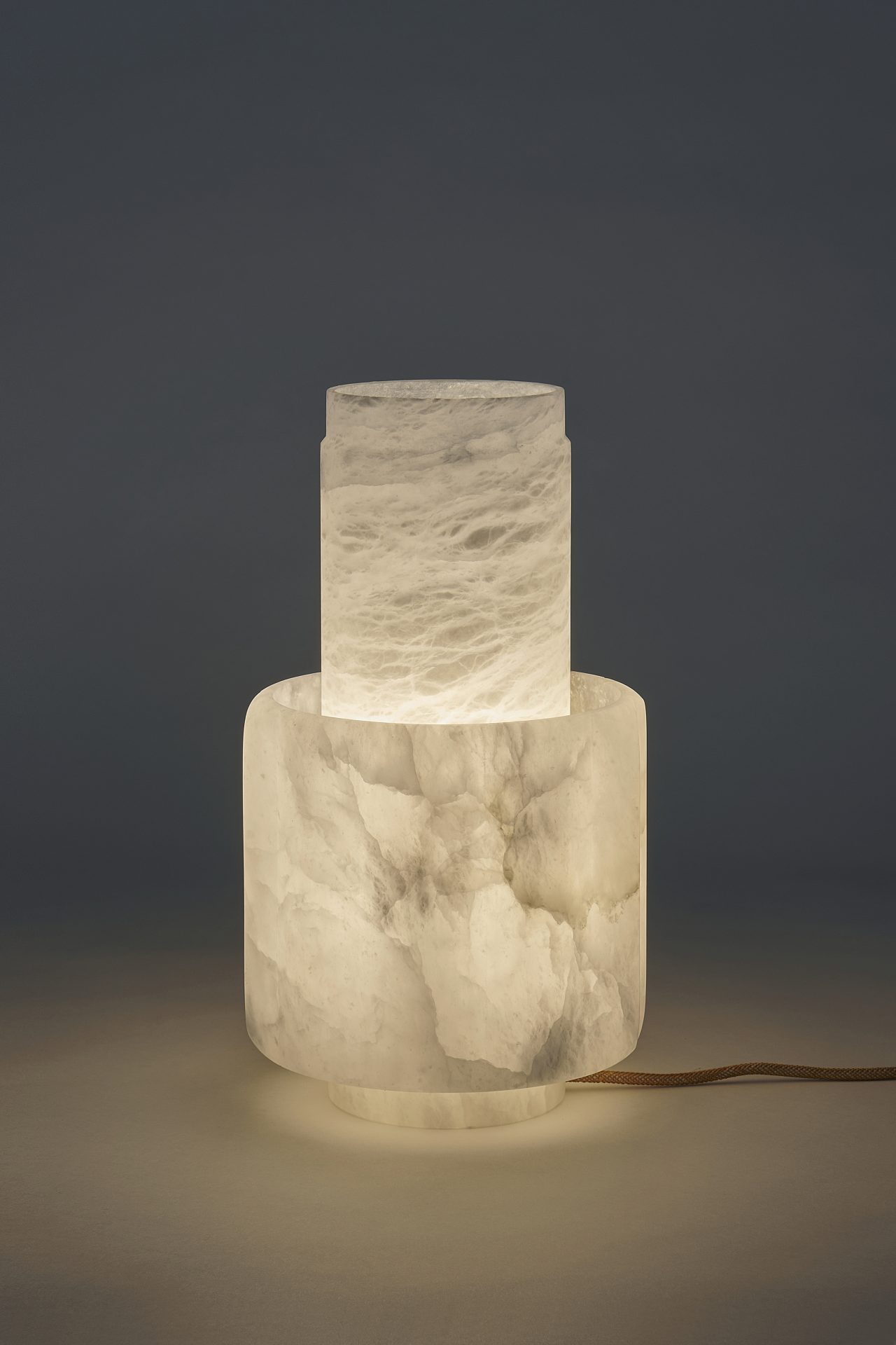 Dans un vocabulaire toujours très géométrique, cette famille de lampes révèle la matière translucide et organique de l’albâtre.