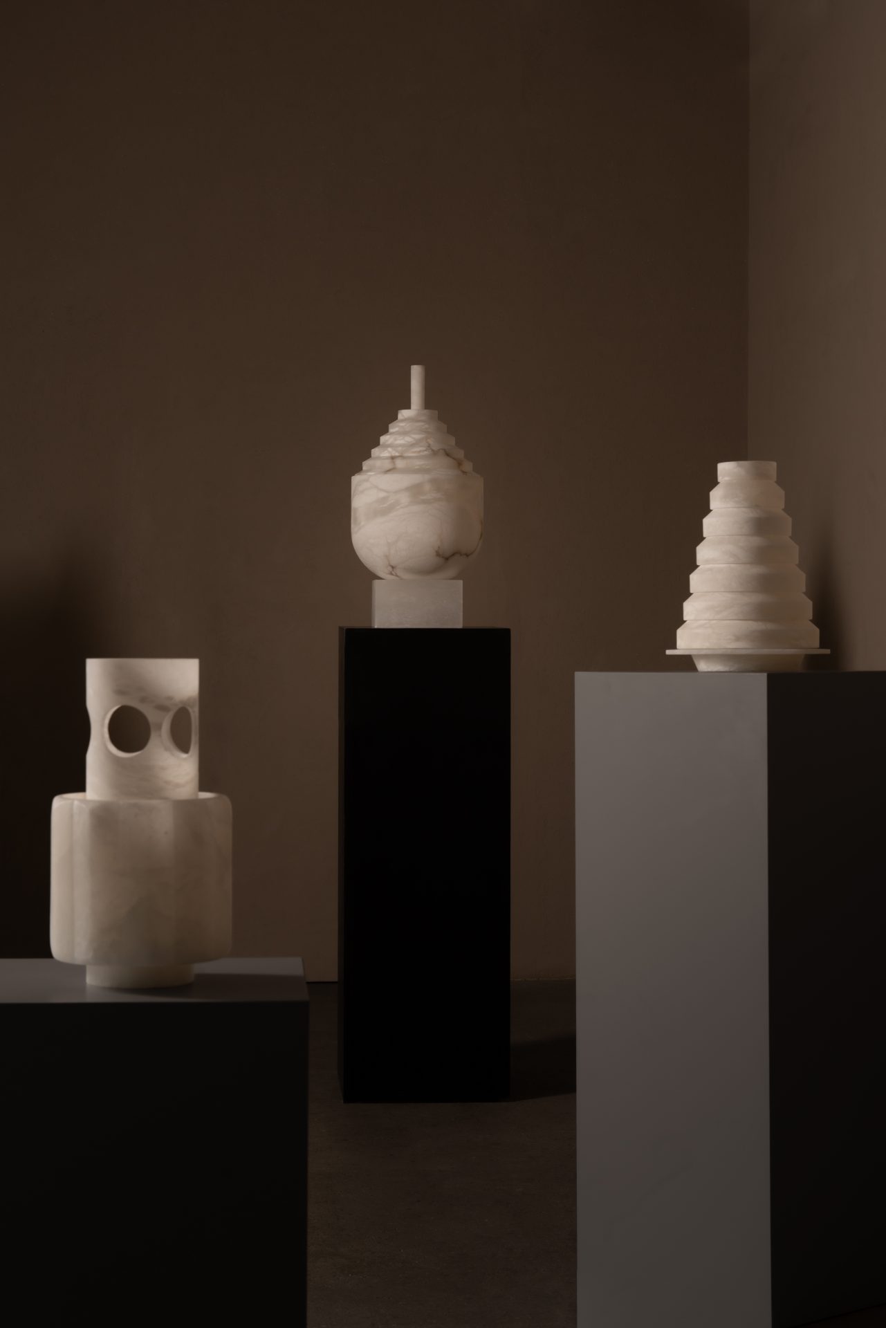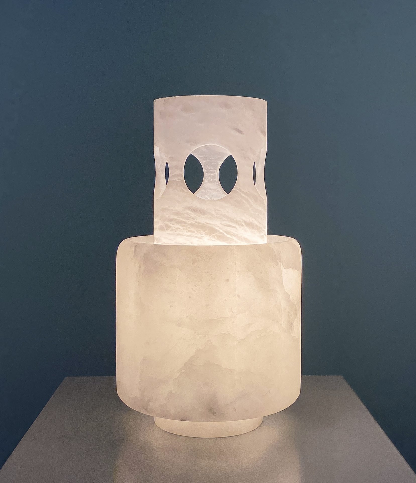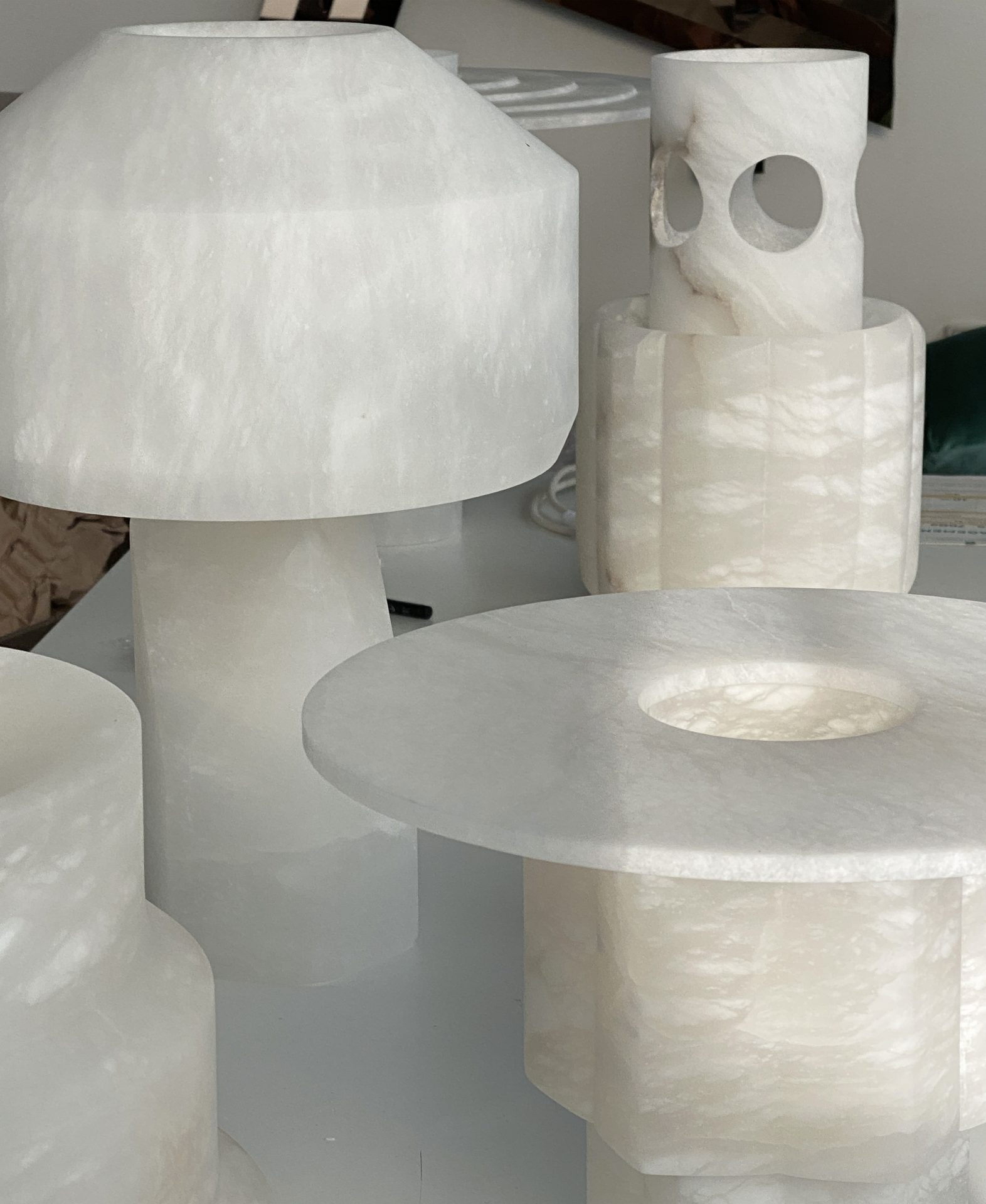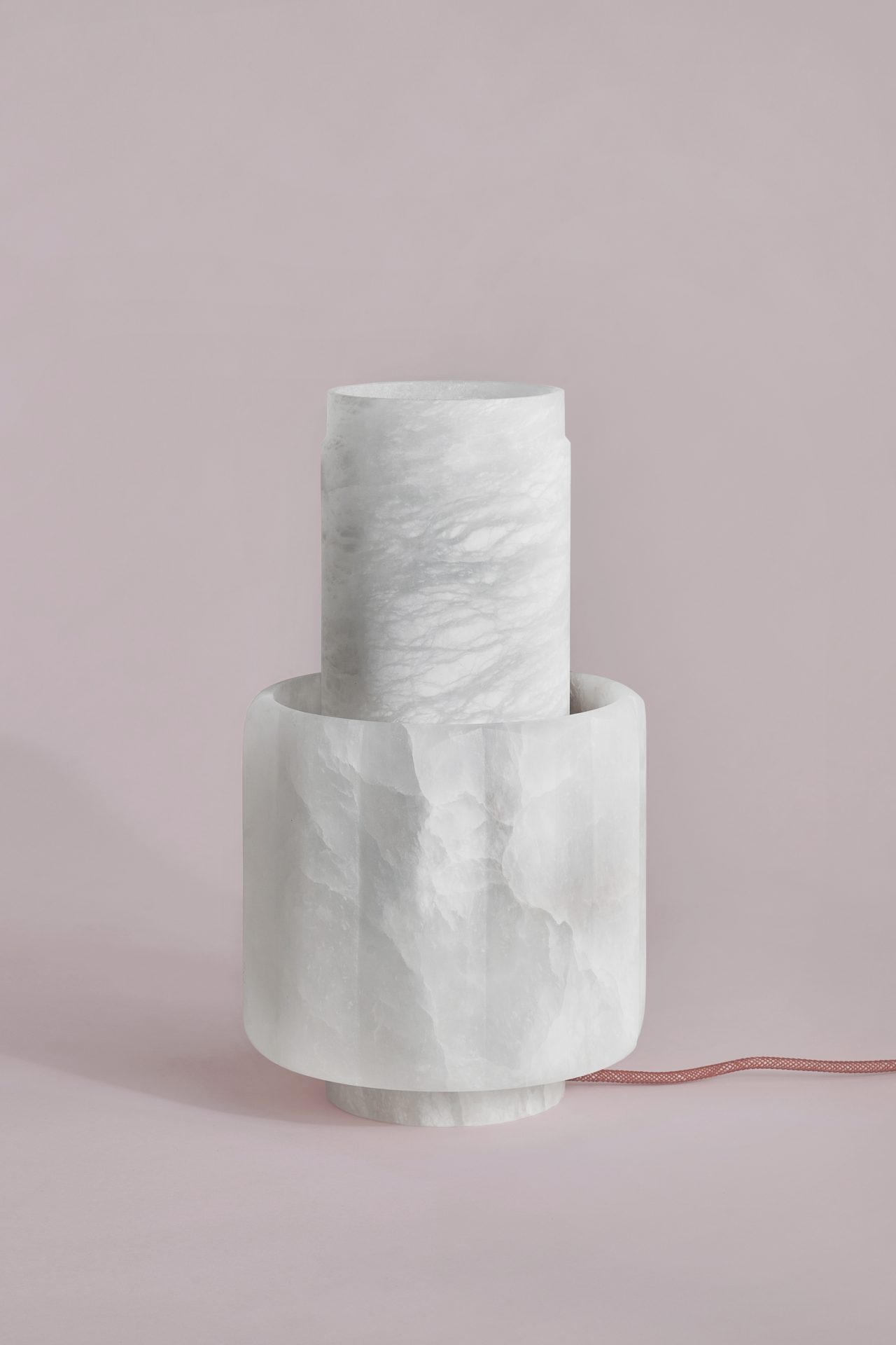 Dans un vocabulaire toujours très géométrique, cette famille de lampes révèle la matière translucide et organique de l’albâtre.