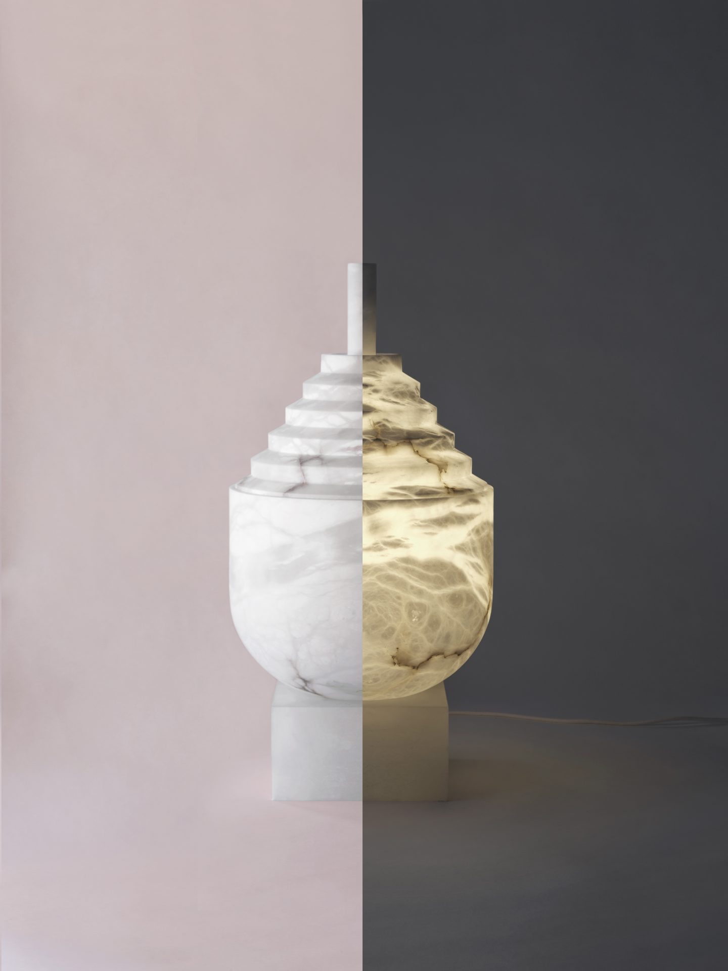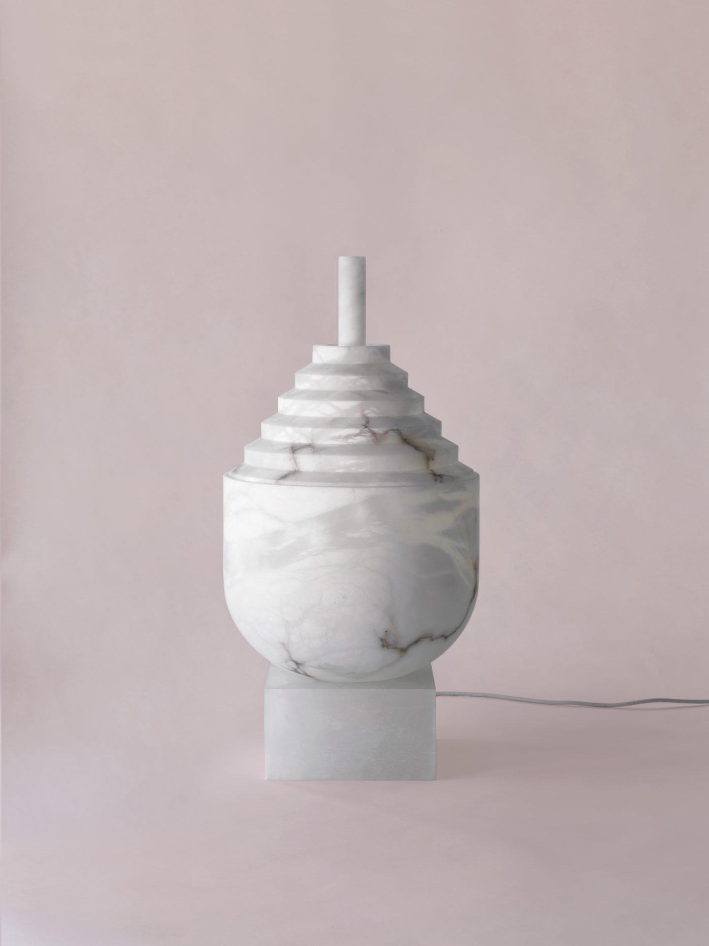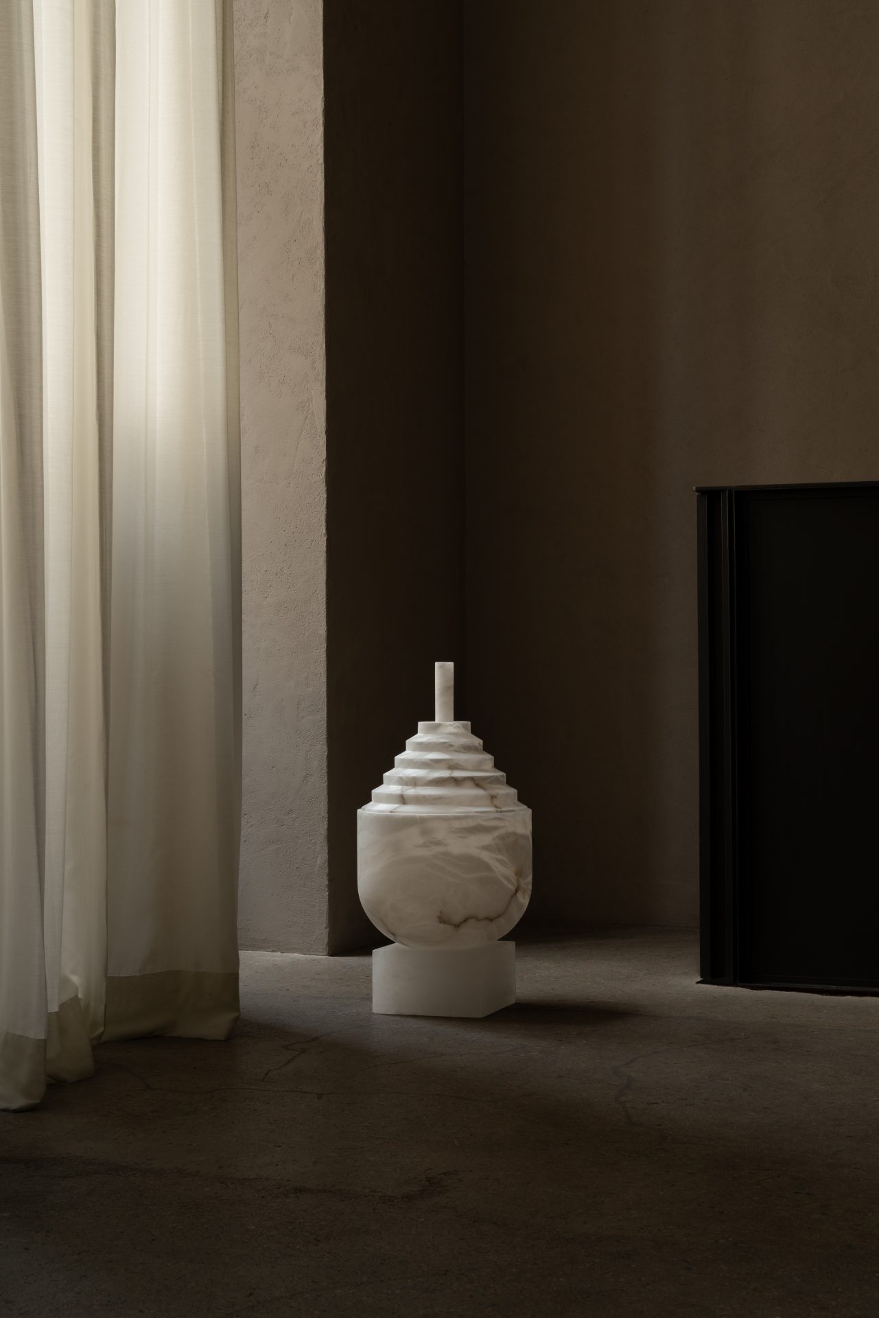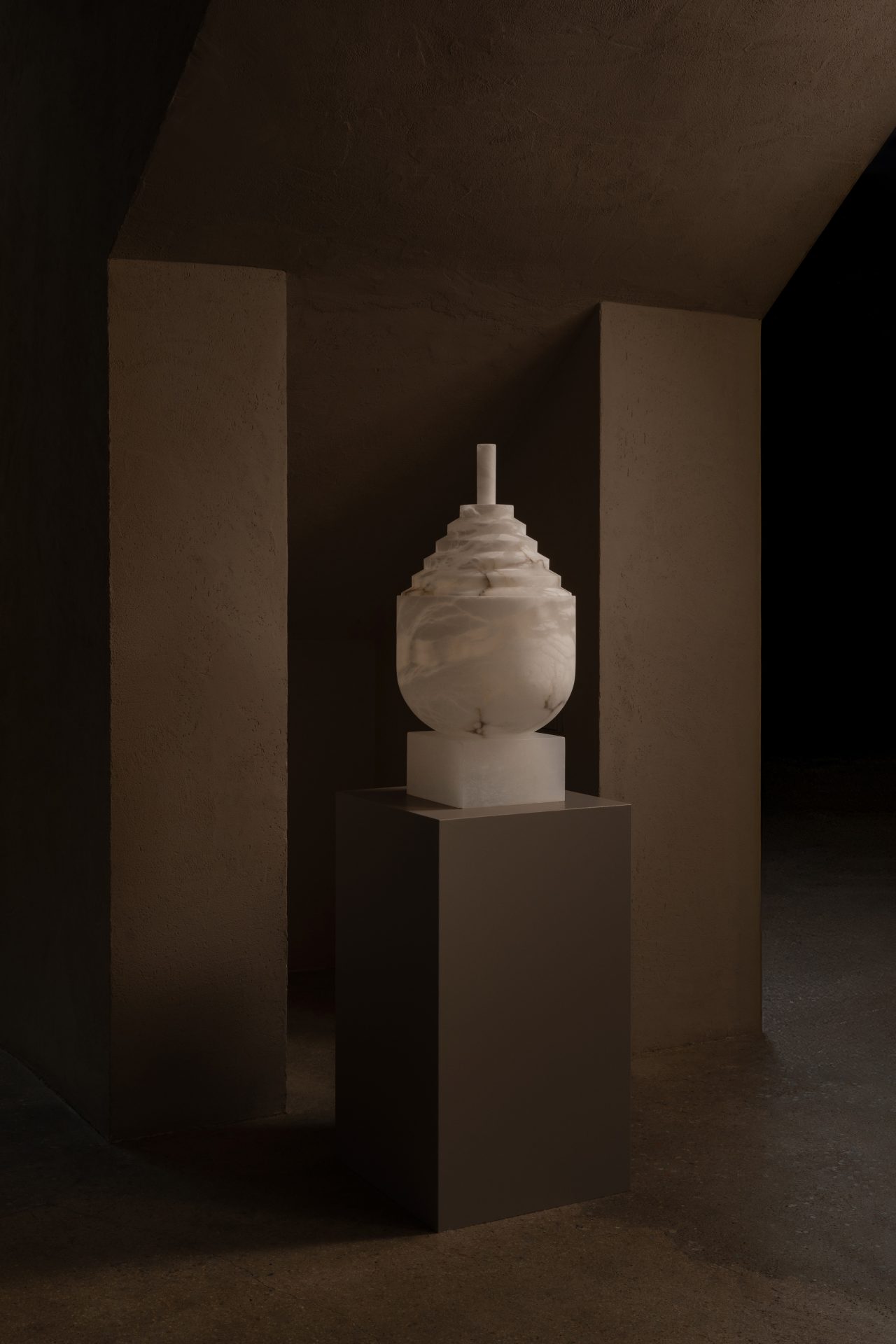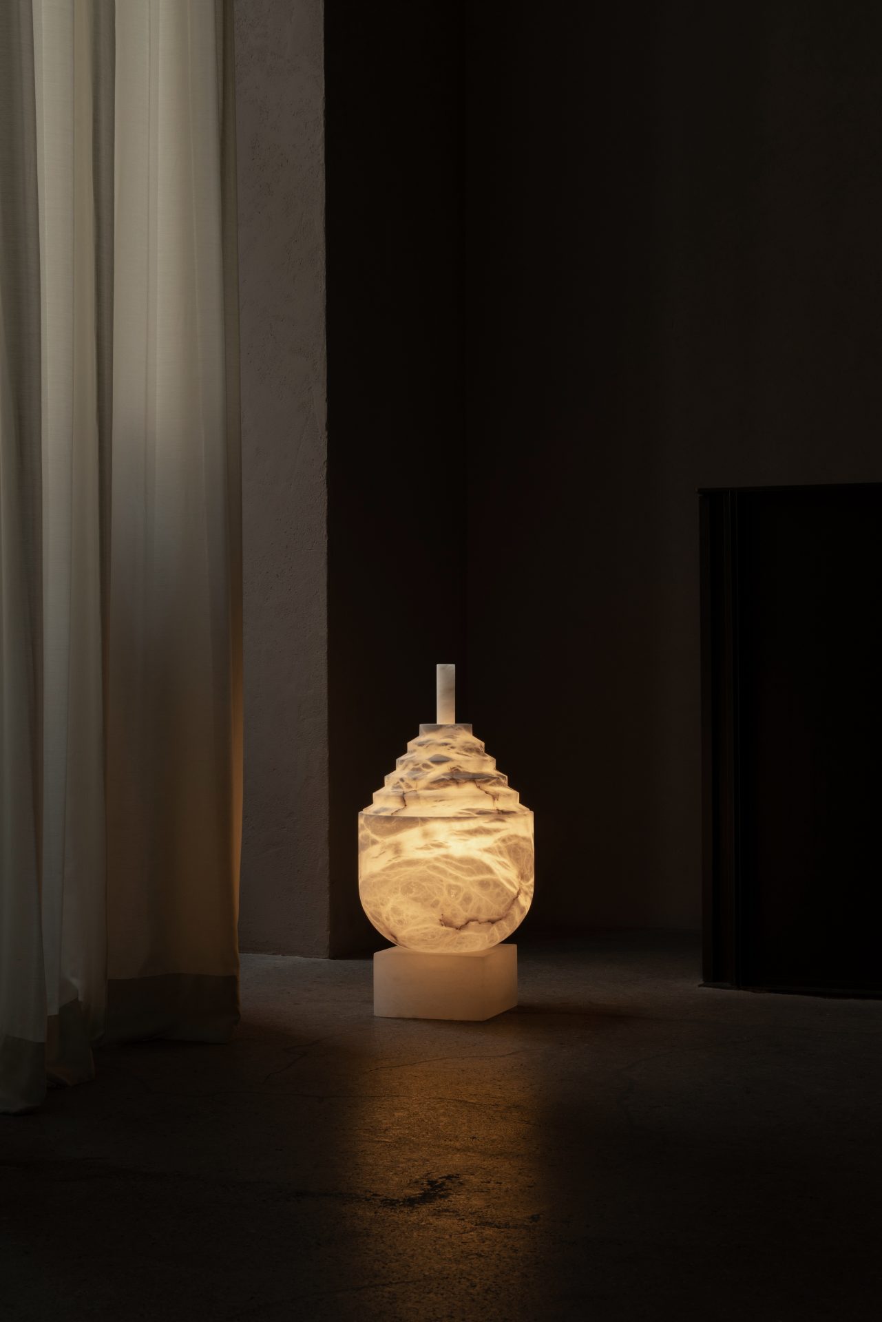 Chaque luminaire est unique, façonné dans un bloc d’albâtre dont le veinage naturel raconte une histoire différente. Elle s’inscrit dans une recherche à la fois poétique et minérale, où chaque pièce devient une oeuvre à part entière, porteuse de sa propre expression.